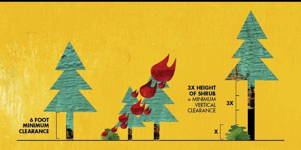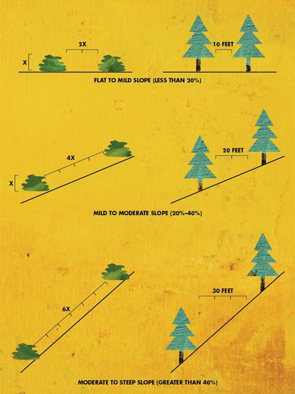 The spacing between grass, shrubs, and trees is crucial to reduce the spread of wildfires. The spacing needed is determined by the type and size of brush and trees, as well as the slope of the land. For example, a property on a steep slope with larger vegetation requires greater spacing between trees and shrubs than a level property that has small, sparse vegetation.